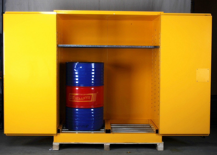 A forma segura de recolher e armazenar resíduos perigosos inflamáveis é com os armários de tambores de resíduos perigosos SSL®. Os armários estão equipados com uma prateleira para conter recipientes de 5 litros.